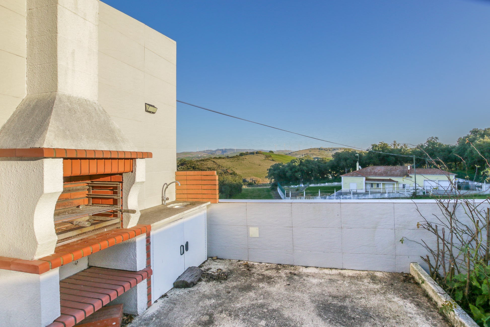 No exterior, dispõe ainda de três pontos de água, um com sistema de rega gota-a-gota (para árvores de fruto); espaço para dois carros com acesso através de portão com sistema de abertura AUTOMÁTICO e um espaço para armazenamento de lenha sob uma escada.