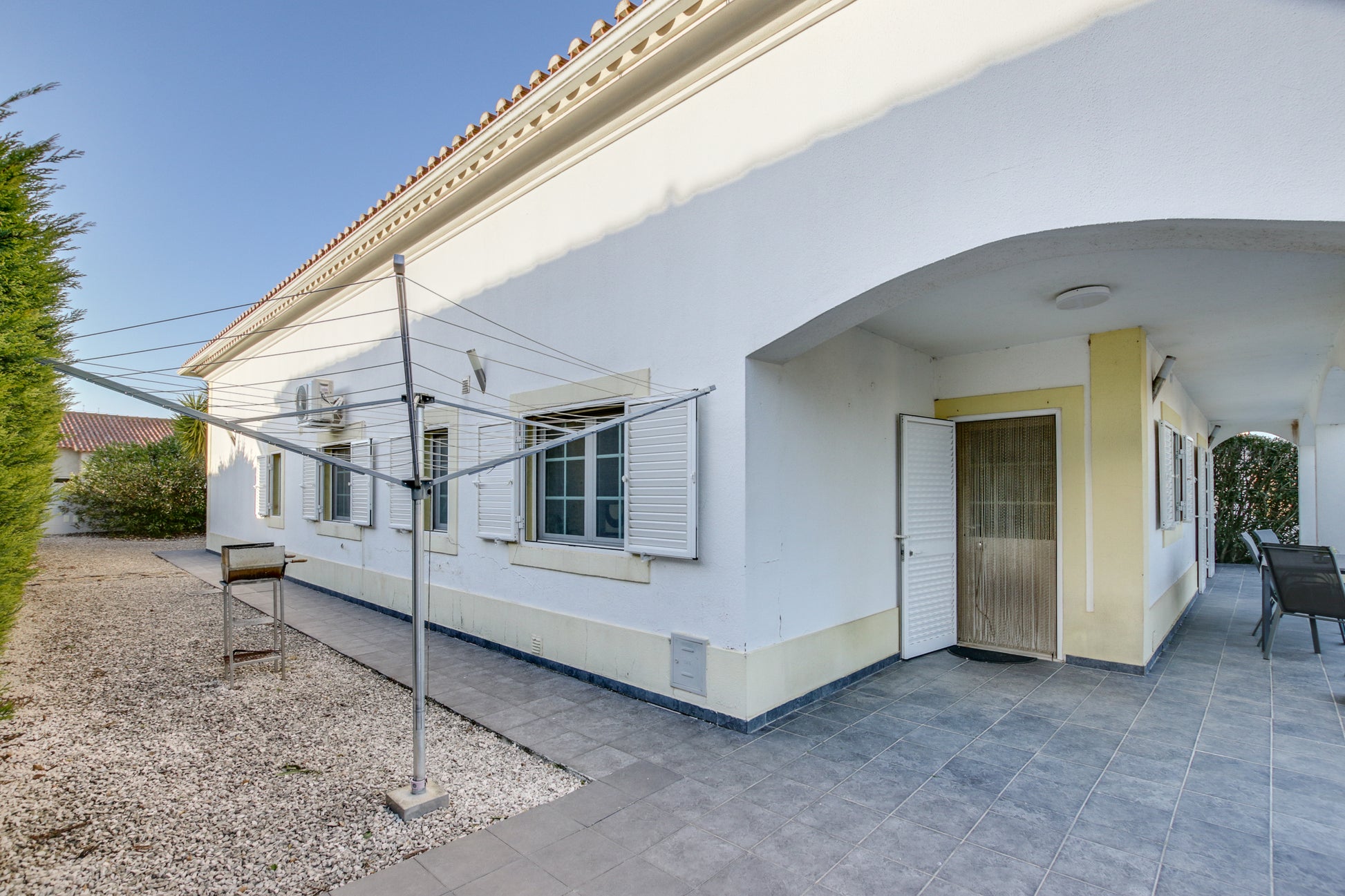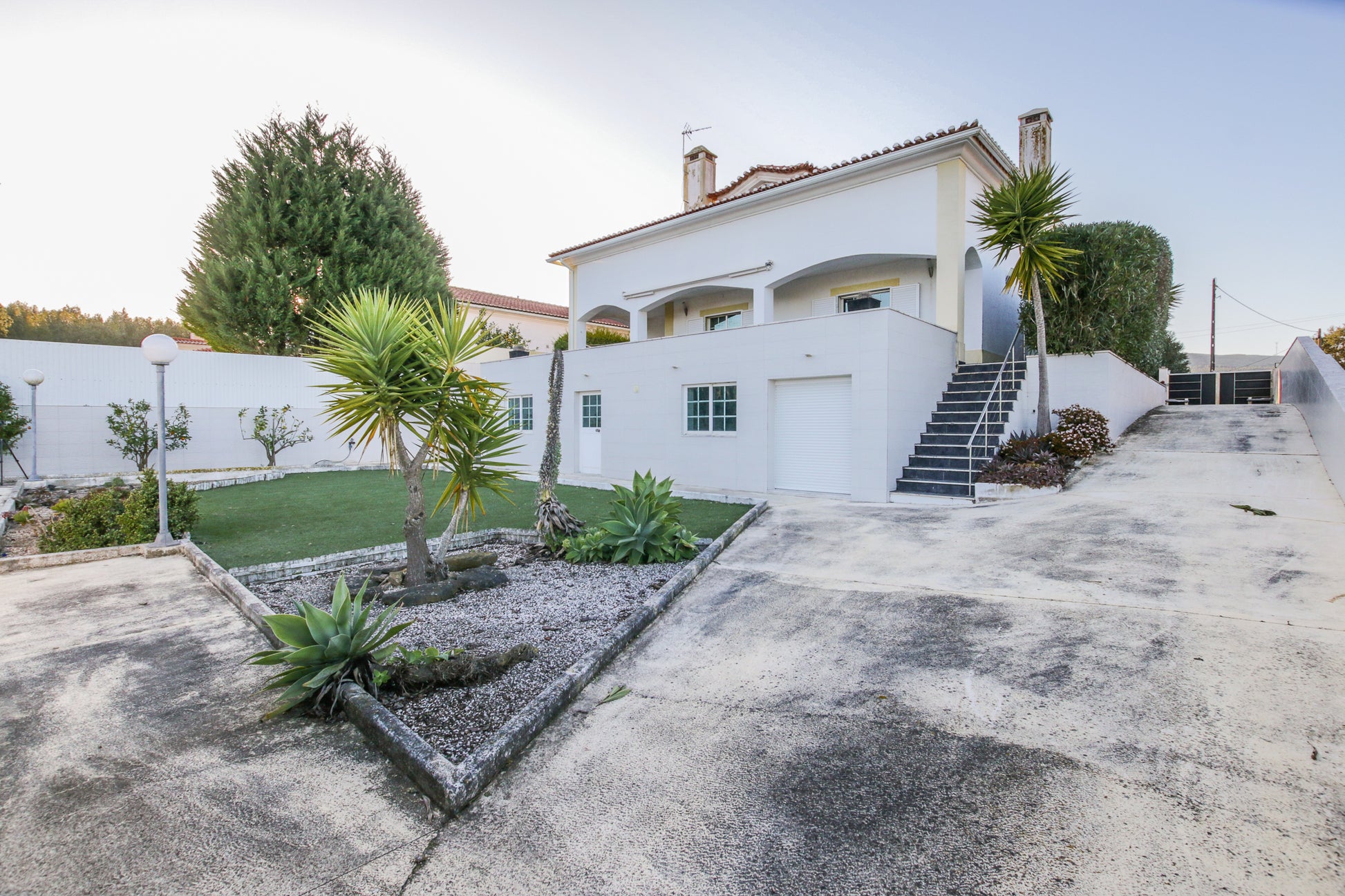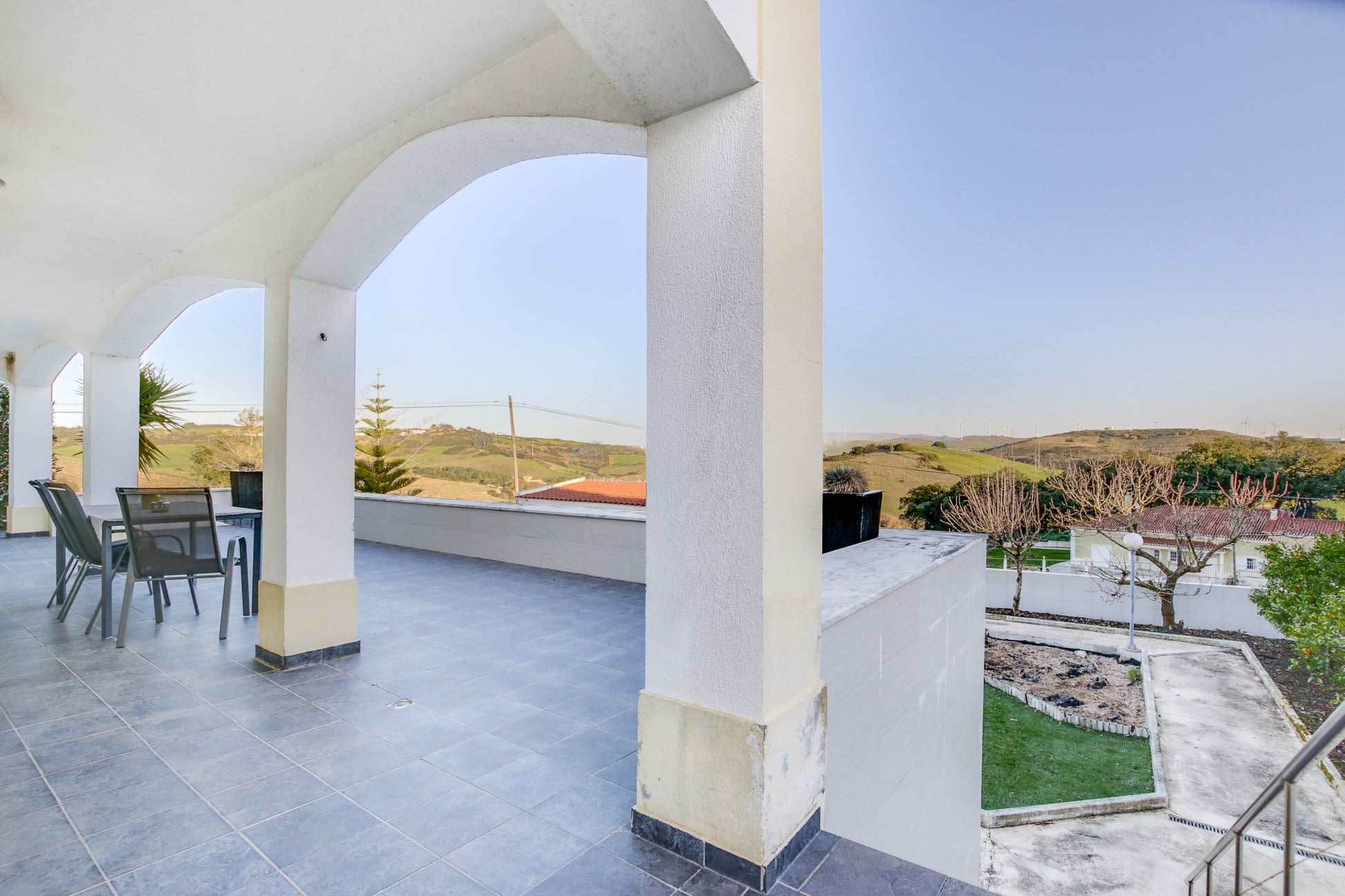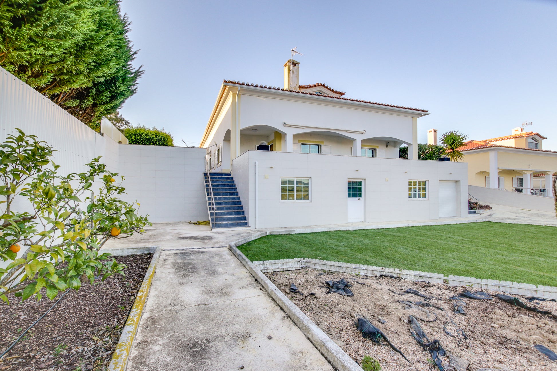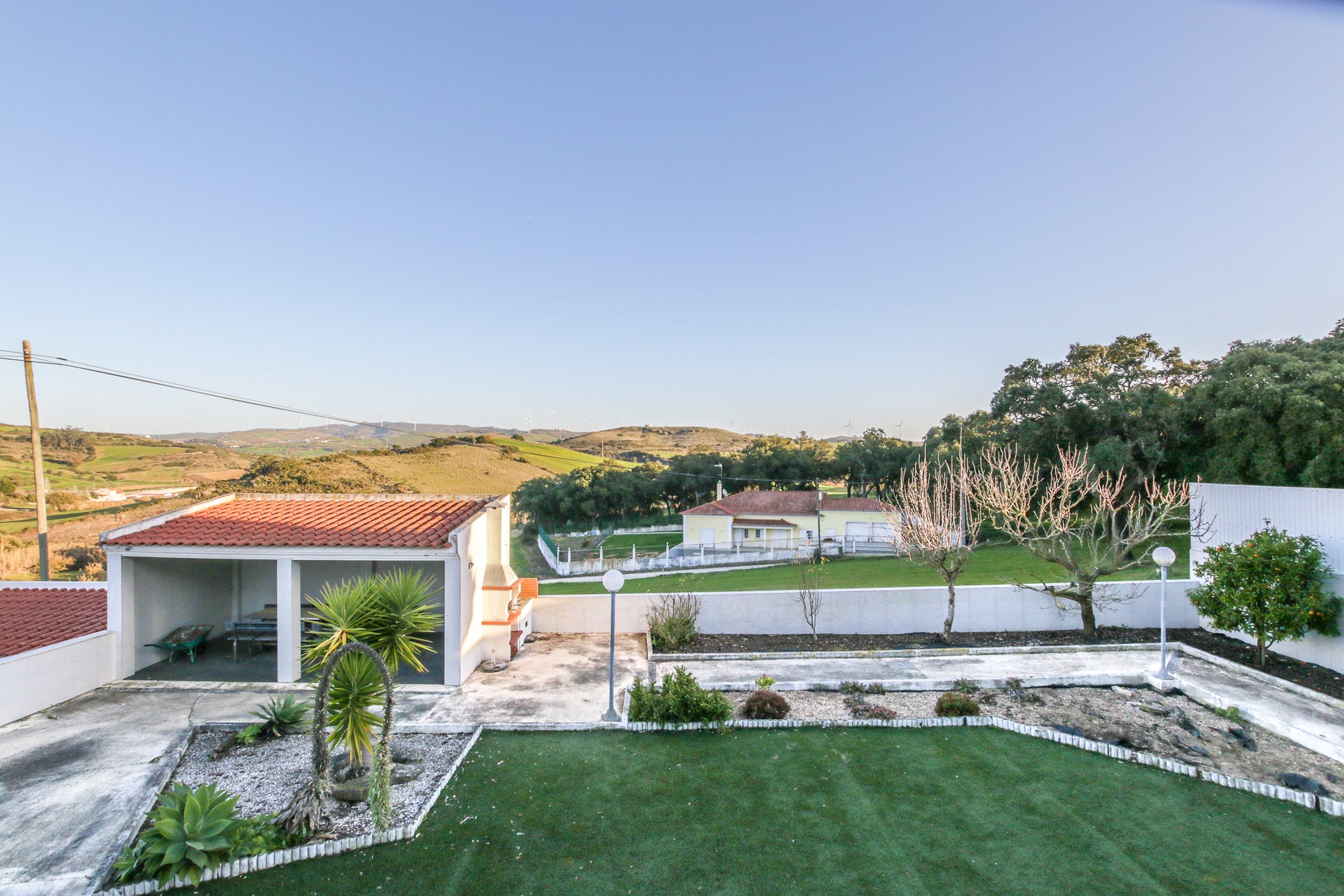 Além disso, conta com um alpendre de 60m², jardim exterior com área de relva sintética (110m²), um canteiro com árvores de fruto (limoeiro, laranjeira, Clementineiro, damasqueiro, pereira (rocha) e macieira (bravo-Esmolfe)), 11 canteiros individuais bem ajardinados com cactos, yuccas, leylandii, oleandros, etc.
