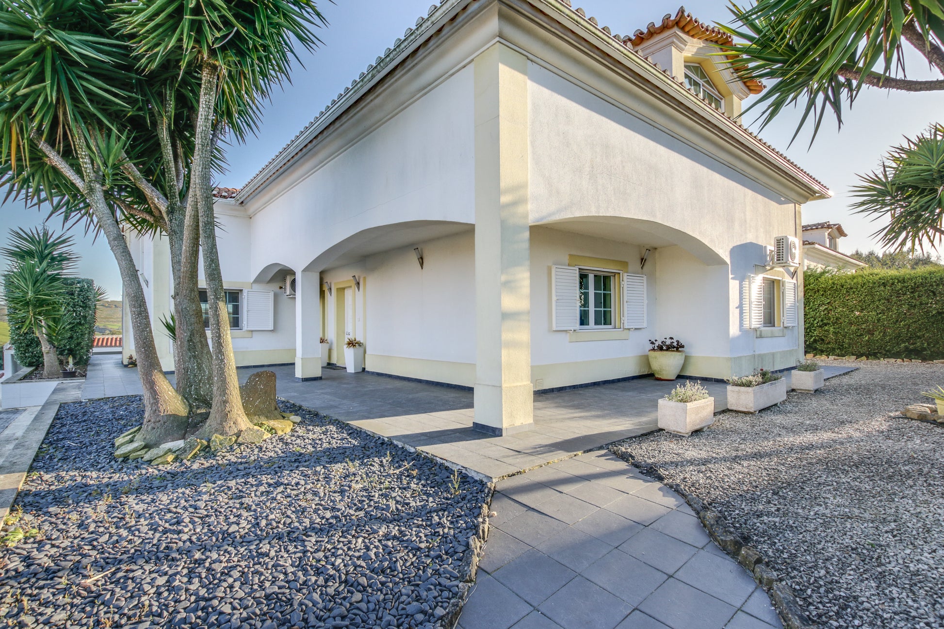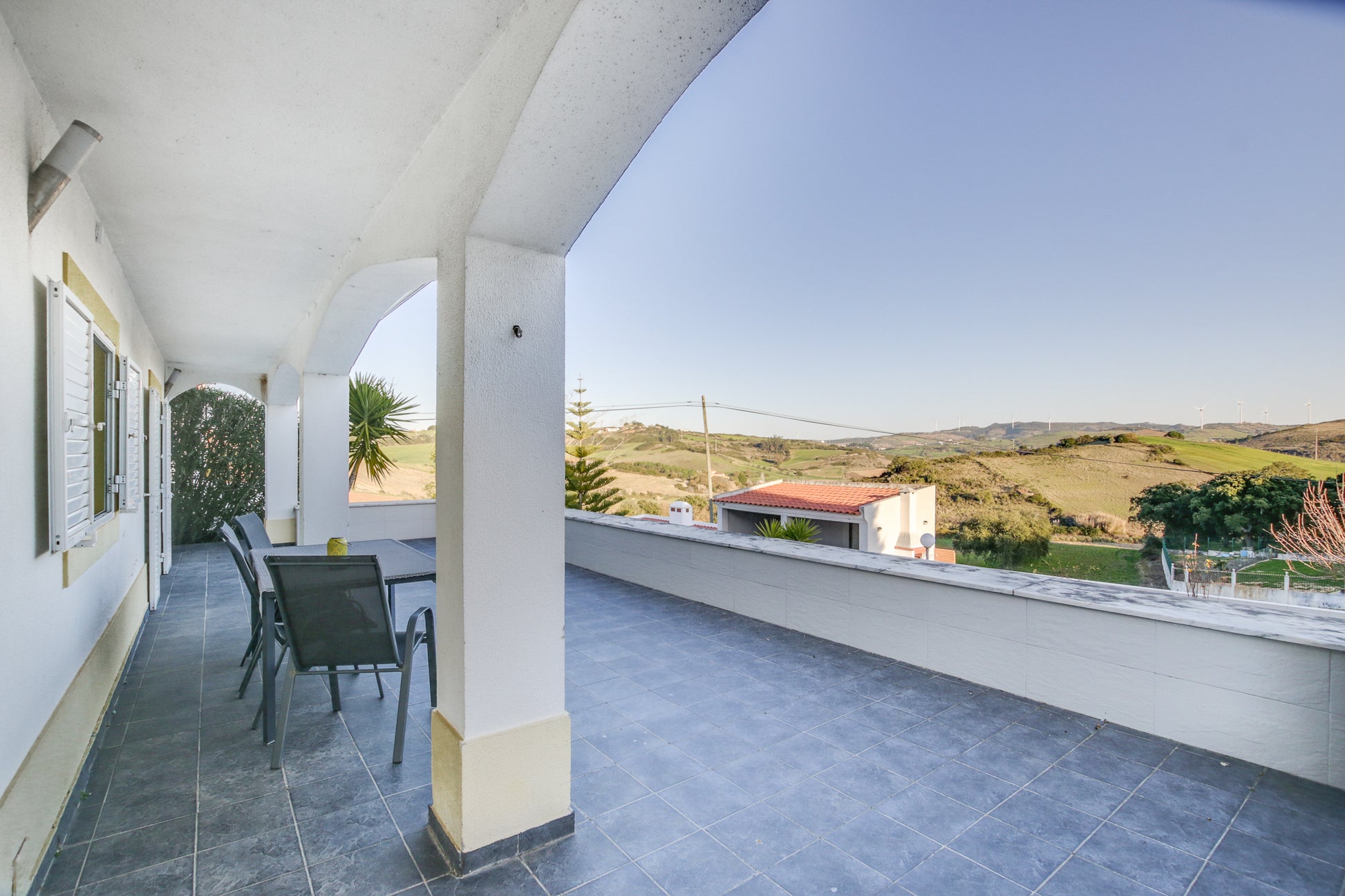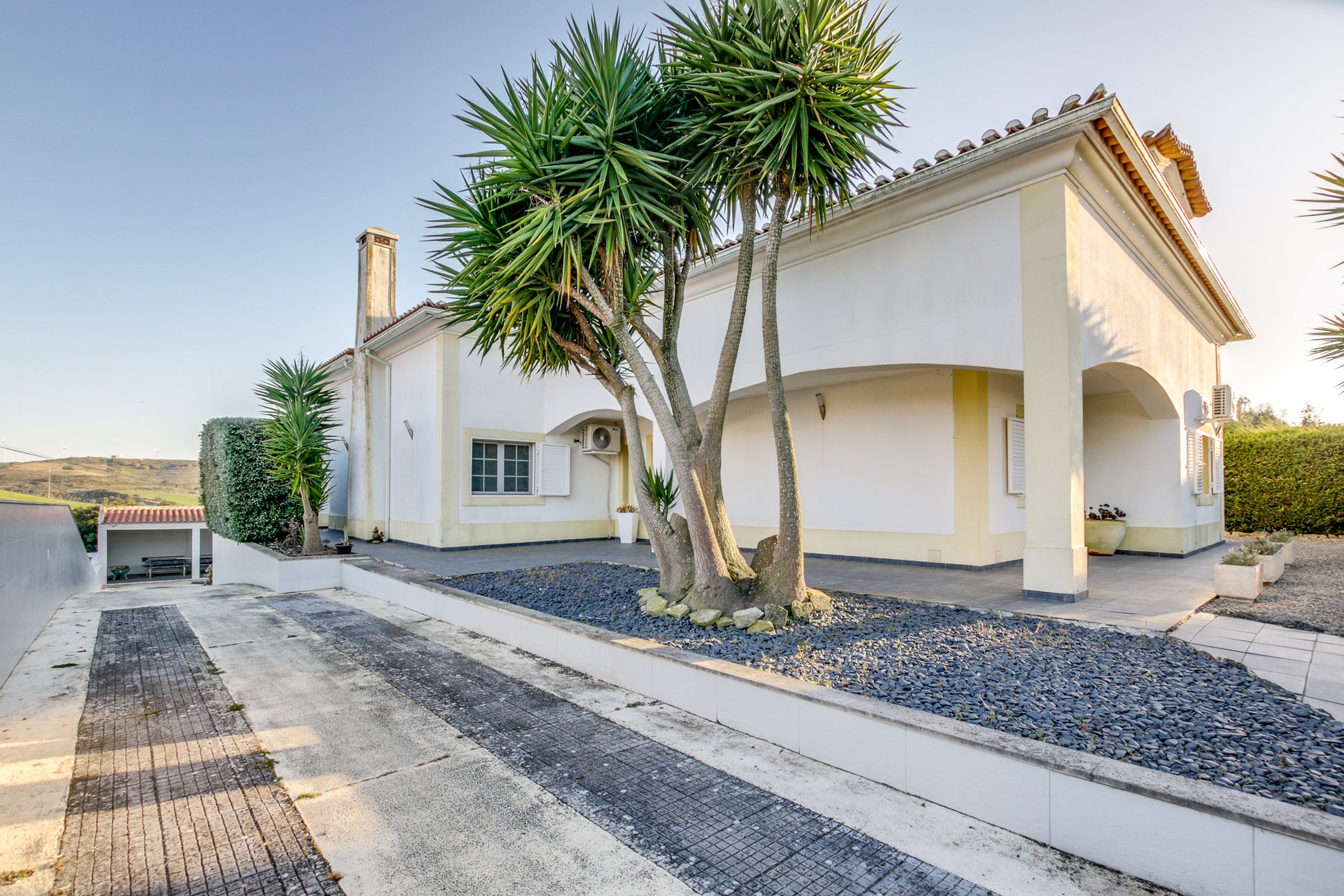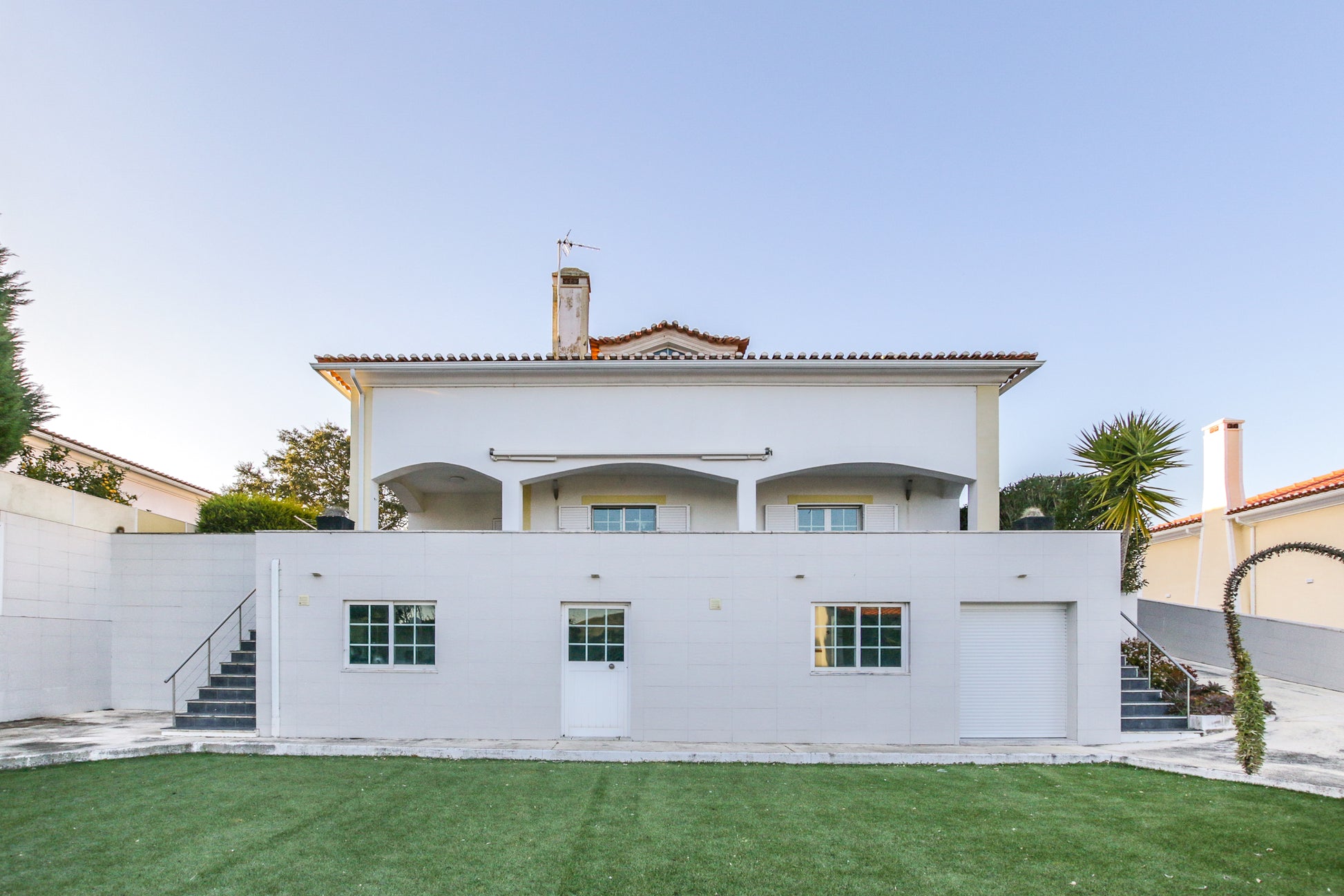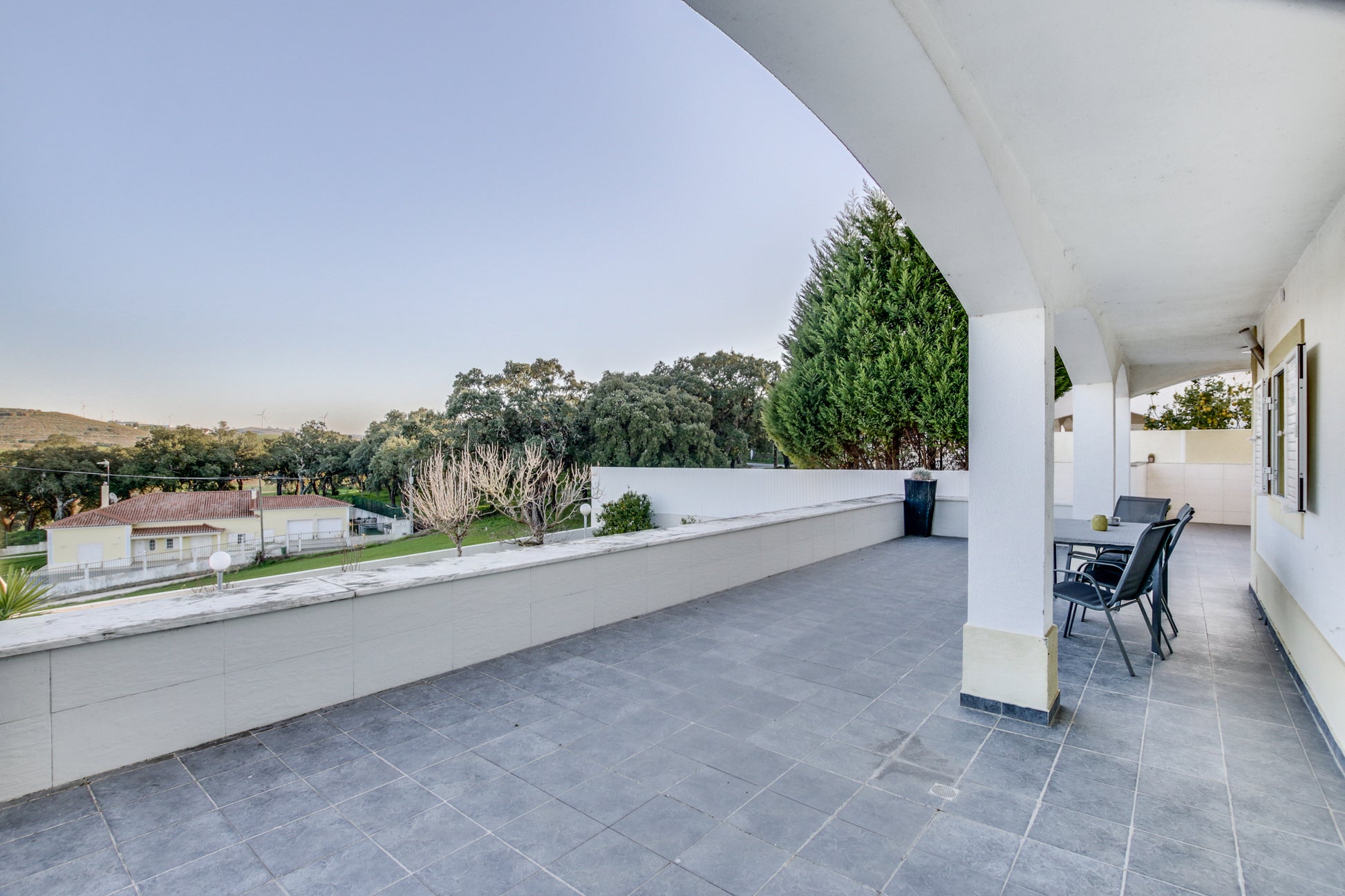 Além disso, conta com um alpendre de 60m², jardim exterior com área de relva sintética (110m²), um canteiro com árvores de fruto (limoeiro, laranjeira, Clementineiro, damasqueiro, pereira (rocha) e macieira (bravo-Esmolfe)), 11 canteiros individuais bem ajardinados com cactos, yuccas, leylandii, oleandros, etc.